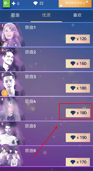 4、一曲弹完,系统会根据你的表现结算分数,然后给你发点钻石奖励。这些钻石就是货币,攒够了就能去解锁更多新歌。