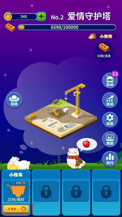 2.这游戏本质上就是闯关,一关一个建造目标。为了让你不那么累,可以花金币升级你的小推车之类的工具,加快搬砖效率。中间还会跳出个“ET小问答”,答对了能临时加个buff,搬砖更快。当然,钱不够了还能搞搞投资,让钱生钱,再用赚来的钱升级工具,一套循环下来,懂的都懂。