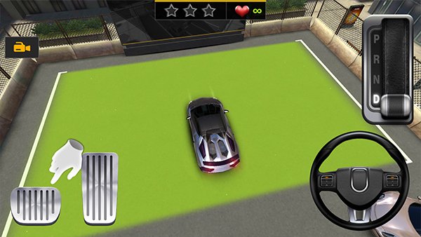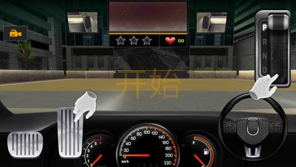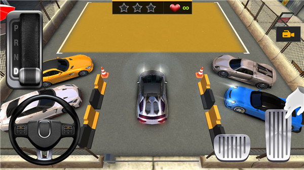 4、界面布局挺清楚的,左边是刹车和油门,中间是方向盘。左上角切换视角,右上角是档位。你需要根据自己的习惯去调整车的位置,控制好方向,千万别撞了,最后把车稳稳停进库里就行。讲真,这UI稍微有点复古,但功能确实没毛病。