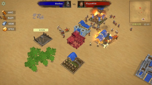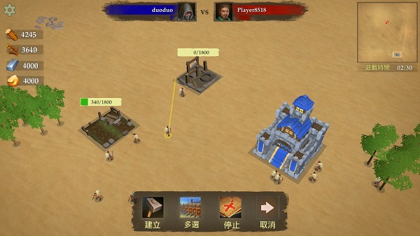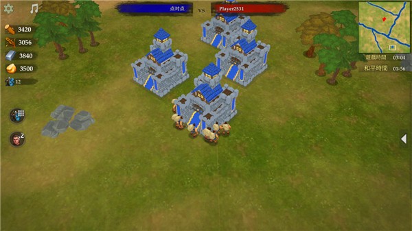 选完模式就直接开打了。你可以指挥工人去盖各种建筑,比如农场挖矿啥的。这游戏的建造系统有点像沙盒,给你一片大地,你想在哪盖就在哪盖。不断发展,训练士兵,朝着胜利冲就完事了。