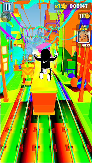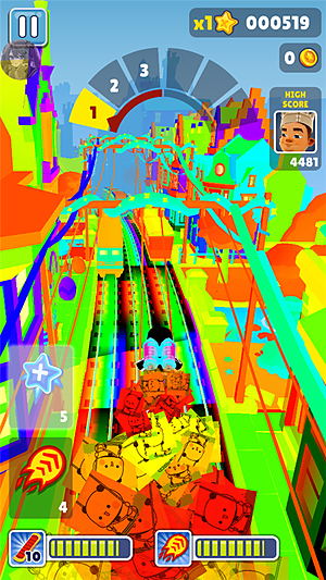 - 游戏里任何时候,只要你对着屏幕连敲两下,就能激活滑板(Hoverboard)。用了滑板就等于多了一条命,撞一下也死不了,就是滑板会消失。看下面这张图,脚底下踩的就是。