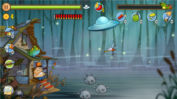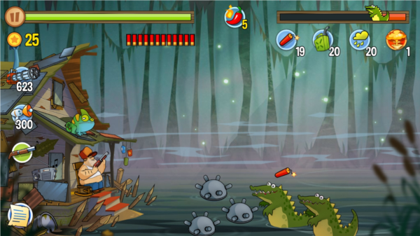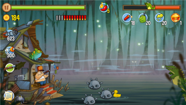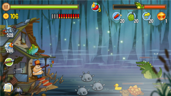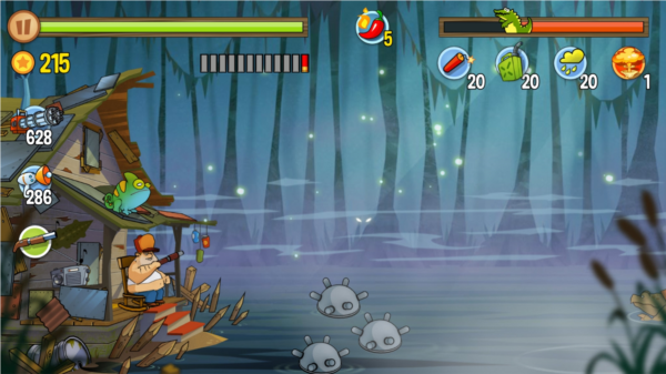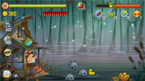 这游戏的过关逻辑贼简单,就是守住你家那小破屋,别让沼泽里那帮奇奇怪怪的动物冲进来就行。它们敢露头,你就负责把它们全都送走。