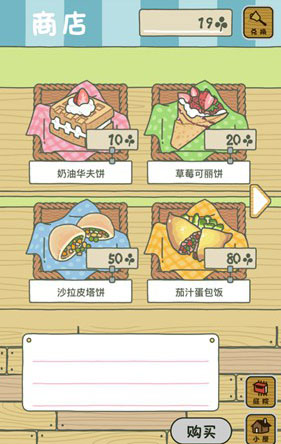 三叶草攒够了之后,点屏幕右下角的“商店”进去。看看这商店界面,里面一堆吃的,咱们刚开始穷,就先用10个三叶草买个最便宜的便当凑合一下。