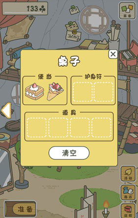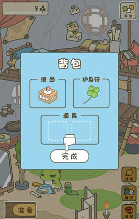 蛙出门前,你得给他收拾行李,主要是吃的、护身符和一些道具。最基本的就是便当,没吃的走不远。买东西要用三叶草,得去院子里收。点右下角那个“庭院”按钮就能过去。