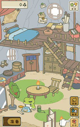 买完东西就点右下角的“小屋”回房间。到屋里,点左下角的“准备”按钮,开始给蛙儿子装行李。