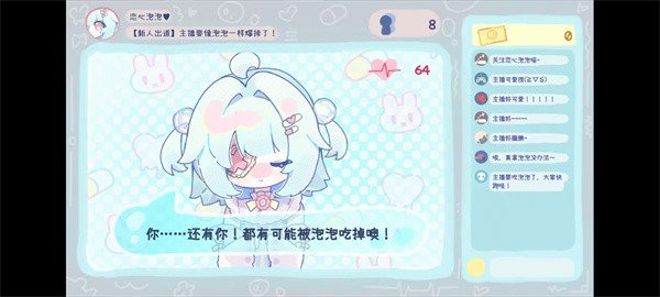 主播要像泡泡一样爆掉了手游是一款画风清新的虚拟主播模拟游戏,游戏中玩家要扮演新人虚拟偶像"恋心泡泡",从零开始经营自己的直播间,特别设计的心率监控系统会实时反映主播状态,当情绪过于激动时,主播真的会像泡泡一样"砰"的消失哦!通过不断积累直播经验,玩家可以慢慢解锁更多互动内容和特殊事件,最终成为超人气Vtuber。