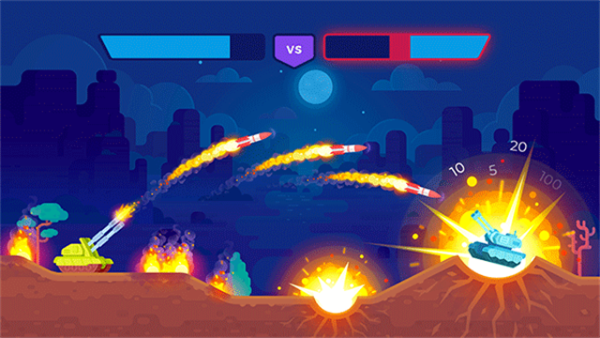 坦克明星是一款坦克对战类游戏,一开局两边隔着地形对峙,先停下来观察角度和距离,再慢慢调整炮口把导弹打出去,炮弹飞在空中划出弧线,落点刚好压中时会直接炸开一大片,有时候地形会挡住路线,需要多试几次才能找到合适角度,不同武器打出去效果也完全不一样,有的范围大,有的能冻结目标,打着打着就会想换一种试试看,赢下一场后还能解锁新的坦克和武器,再继续下一局对上新的对手。