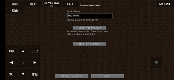 7、在这个界面里,给你的世界起个名,选好游戏模式,然后点下面的“create new world”确认。