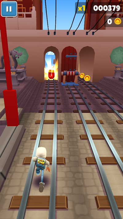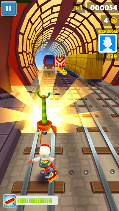 - 跑的时候快速点两下屏幕,滑板就出来了。这玩意儿等于多给你一条命,效果时间内撞一下没事。