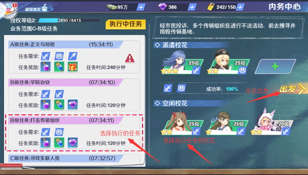 3、别瞎派人,每个任务都有个成功率。任务越高级,对派出去的校花要求也越苛刻。影响成功率的主要有几个:校花的等级、星级、战斗力,还有任务本身有没有指定类型的校花。