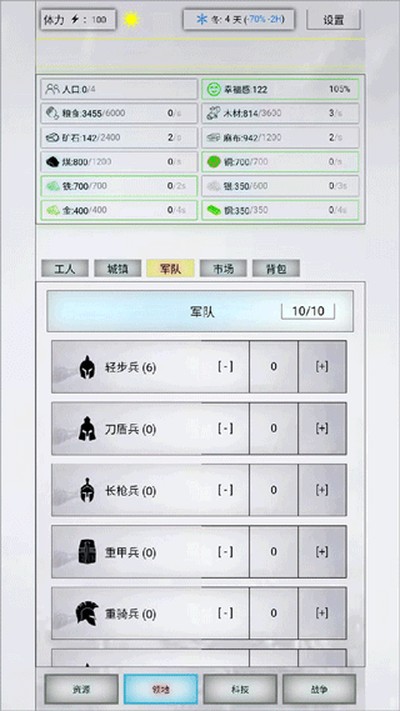 1、开局的思路一定要清晰,就是憋科技。别想着上来就打架,等把特种兵这个兵种解锁了,再拉出去干活。前期就用这帮猛男去扫荡域外,抢地盘、涨人口,效率最高。
