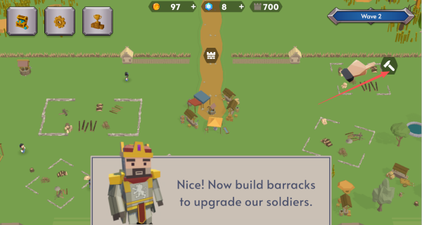 4、优先按照提示建造兵营,这是升级士兵的关键建筑,能为后续战斗提供更强战力。同时留意地图上的建筑规划区域,合理布局建筑。