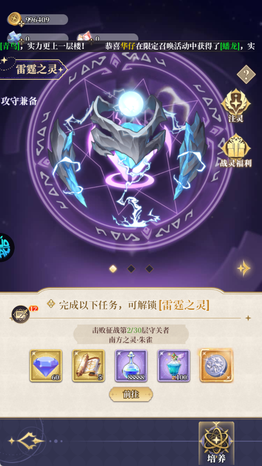 还有个战灵系统,每个战灵都有自己的一套解锁任务。你把任务清完就能解锁,而且等级和阶数是所有战灵共享的,搞定一个等于全员受益,战力加得非常多。就是这解锁任务稍微有点肝,不过为了战力也值了。