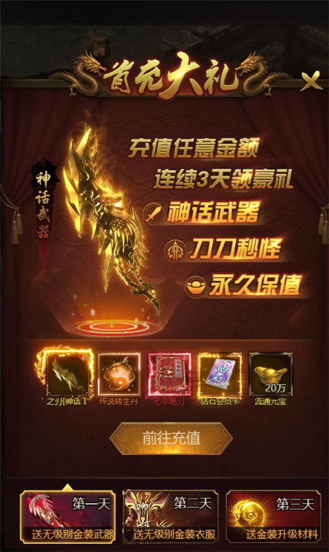 2、然后随便充点钱整个首充,哪怕就几块钱,都能拿到一把神话武器,砍怪跟切菜一样,而且这武器一直都有用。