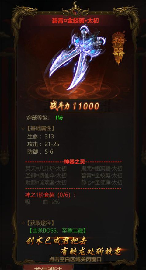 3、打BOSS爆出来的装备、神器什么的,都可以用元宝来升阶,别浪费了。