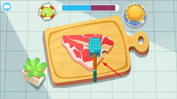 3、点“开始制作”,第一步是拿小锤子捶打牛排,给它松松筋骨。
