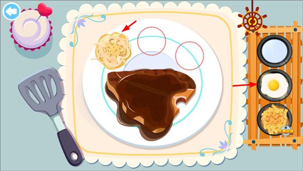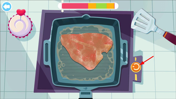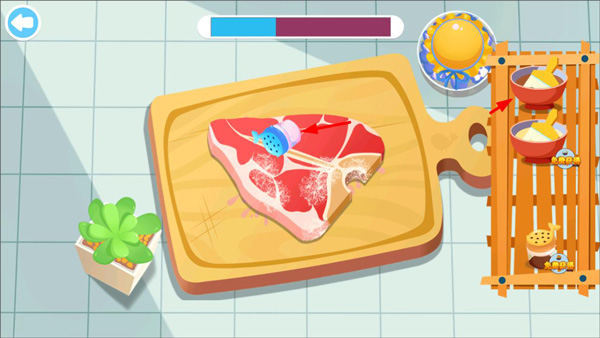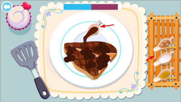4、然后点右边的调料瓶,给牛排抹上调料腌一下。