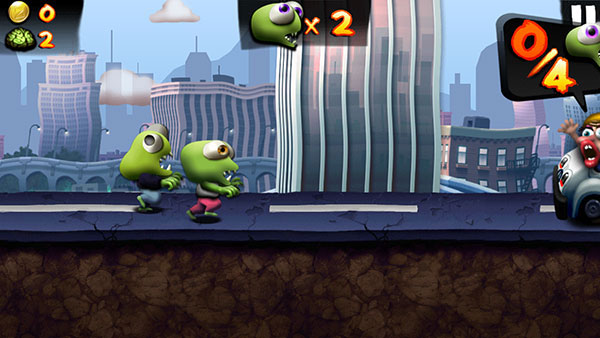 道具:跑着跑着会遇到一个像礼品盒的东西,跳起来顶一下,就能随机开出个道具。道具种类挺多的,有能卷走一切的海啸、隔三差五帮你空投僵尸的UFO、能把障碍物变成金币的小金人、啥都能撞飞的橄榄球队员、跳得老高还能切开障碍的忍者,还有让所有僵尸飘在天上的大头模式等等。