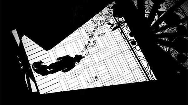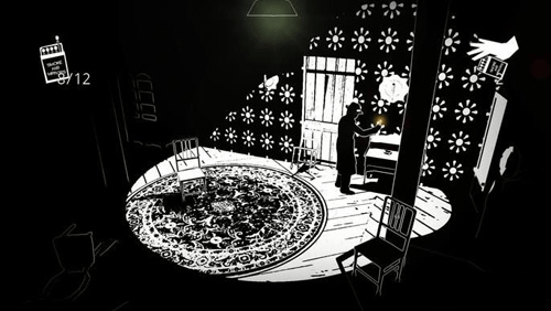 step9:木门里是个放映室,找到一台放映机,把四个画面挨个看一遍。看完之后,注意看窗户透进来的光,会在地上形成一个十字影子,就在影子的正中心,能捡到一把地下室的钥匙。
