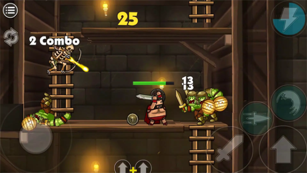 1、横版闯关玩法,左边控制移动,右边跳跃攻击技能,上手很快;