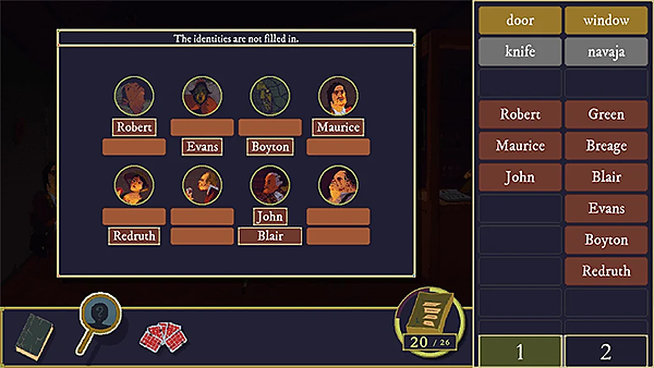 - 游戏分两个面板,一个“探索”面板让你满世界找线索,另一个“思考”面板让你把找到的碎片拼起来。中间坑不少,各种烟雾弹,脑子转不过来真容易被绕进去。