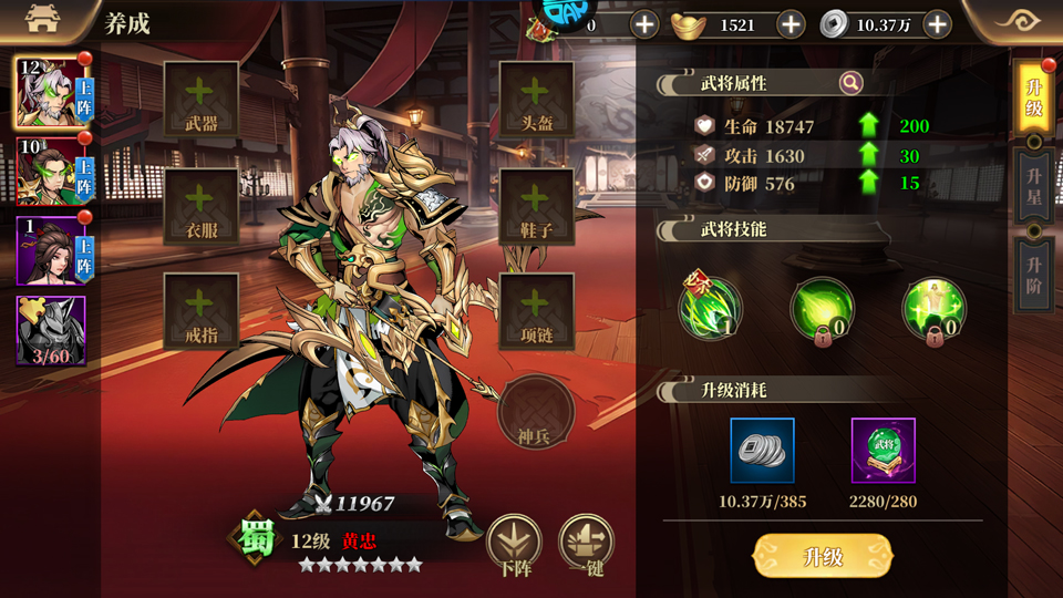 2、卡到手了就得养,升级、升星、升阶,老三样了,一条龙服务把武将战力拉满。