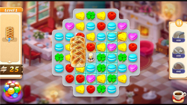 2、所有做菜用的食材,都不是直接买的,而是要通过玩三消关卡来获取。这个设定给游戏加了点奇妙的挑战,不是无脑点点点。
