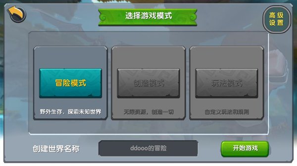 3、模式有三个给你选:想正经生存就玩冒险,想随便造东西就开创造,自定义模式能调的东西更多。看下面这张截图,根据自己口味来。