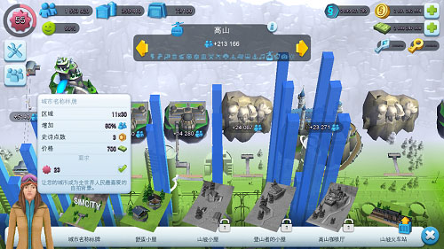 1.高山系统这个东西,要玩家等级到了23级才会解锁。它的建造逻辑跟沙滩区差不多,没有一个所谓的总部建筑,不用先造个A才能解锁B。不过,在建造菜单里,越往右边的建筑通常越高级,而且大部分都需要你先把左边那些低级的给造出来才行。讲真,高山设施的建造成本不低,大部分都要用金钥匙,少数几个特别的得花绿钞。比如第一个城市名称标牌,这玩意儿能把你的城市大名刻在山上,别人来你家串门时,一眼就能看到,倍儿有面子。