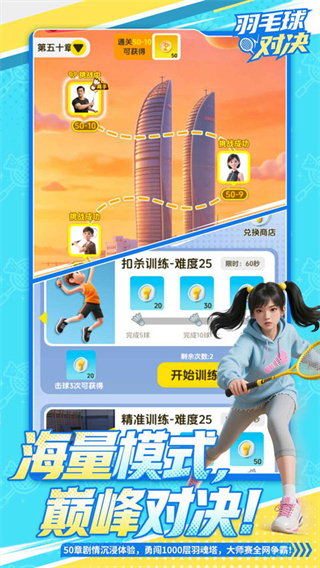 羽毛球对决是一款羽毛球运动主题的竞技对战手游,玩家在游戏中化身球场选手和来自世界各地的对手进行一对一实时比赛,游戏玩法简单,只需要点击和滑动完成发球、扣杀、吊球等动作,但想要赢下比赛,需要良好的反应速度和判断能力,随着比赛胜利可以解锁更强的角色和装备提升属性和技巧,在不同场地中挑战更高水平的对手,游戏法轻松上手又充满竞技性。
