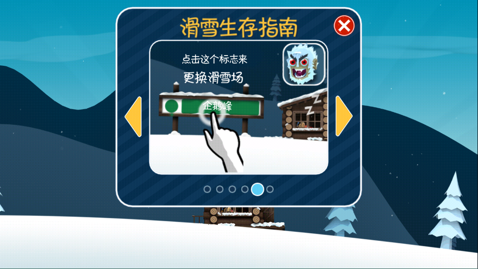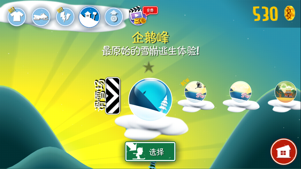 地图有企鹅峰、仙鹤陵、天竺行这几个。新地图有不同的场景,这也是游戏创新的地方——不一定非要在雪里滑,你还可以在沙漠、岩浆里滑。这些地图需要收集星星来解锁,或者直接用游戏币和金币开。