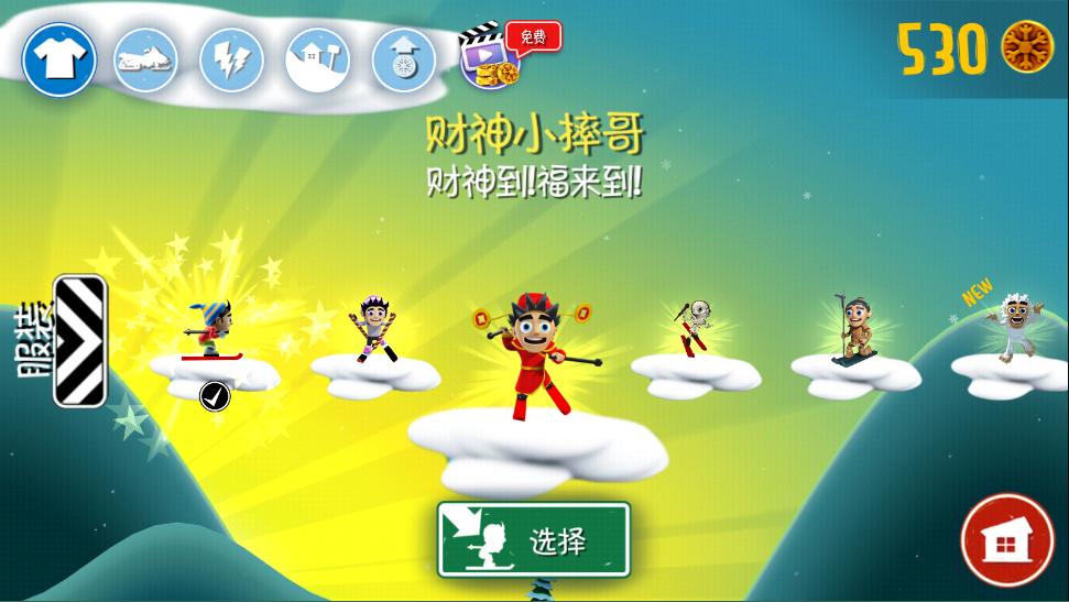 《滑雪大冒险10周年纪念版》里加了新角色,比如小摔哥、周年小摔哥和财神小摔哥。每个角色的样子都不一样,另外你还能收集金币给他们买各种装饰,这点和以前的版本一样。