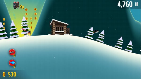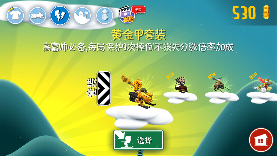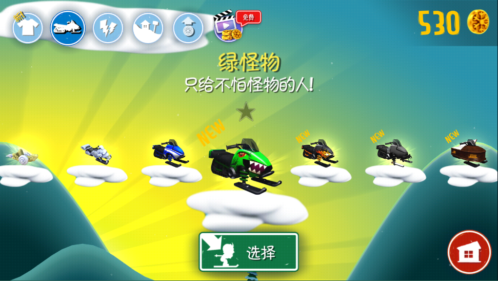 雪地摩托也有好几种,我就不一个个说了。这里提醒一下,在游戏里滑雪时,尽量骑上路上碰到的动物,比如企鹅、雪怪,或者开上摩托。有了坐骑之后速度会快很多,这样才能甩开后面的雪崩。想拿高分的话,还得拼命吃金币。