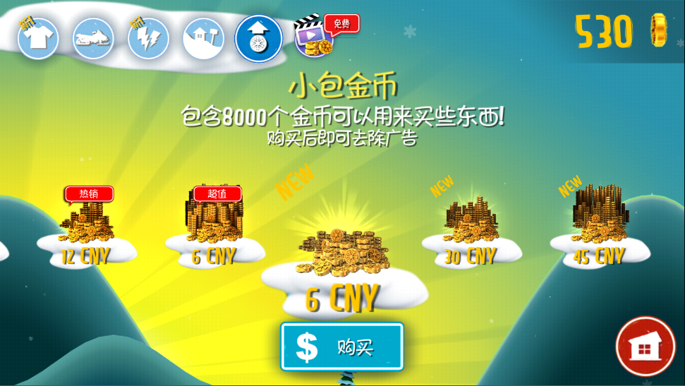 这个包里有8000个金币,可以用来买点东西。买了之后还能顺便把广告去掉。顺带一提,游戏币是在滑雪过程中收集的,还能用来复活。