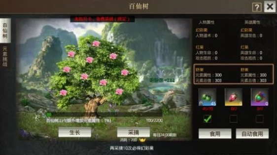 百仙果一共有三种,分别是野果、红果和幻彩果。幻彩果的效果最好,可以提升人物的道术和英雄的攻击力。野果能提供一些元素属性。虽然这个东西感觉有点花钱,但总体上影响不算太大。