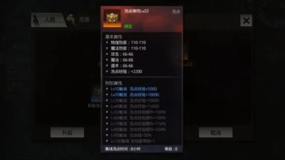 泡点神符就跟主角的勋章一样,可以一直升级。每升10级就会激活一条附加属性,让泡点获得的经验变多。到后期升满了,还会让所有技能等级都加1,这个提升相当可观,战力自然也上去了。