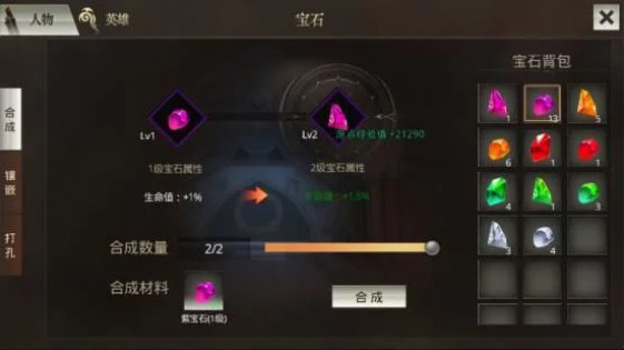 圣石可以理解为镶嵌在装备上的宝石,也能不断升级。不同部位的装备,镶嵌的圣石属性也不一样。比如武器上的圣石是按百分比提升攻击、魔法和道术,而衣服上的圣石就是加生命值。每件装备可以镶嵌3个圣石,作用还是挺大的。圣石合成起来也挺容易,就是后期合成LV.4的圣石需要一种叫“宝石合成符”的材料,这个得靠打怪才能爆出来。