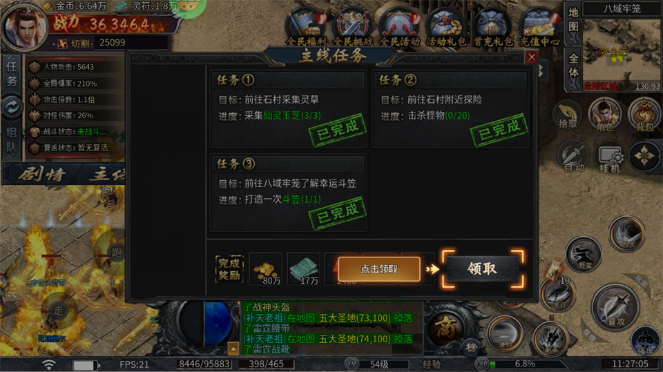 4、后面剧情玩法就解锁了,每天挂机刷刷怪也能拿奖励和称号。