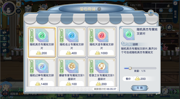 在地境挑战里拿到的【普通萤石】和【高级萤石】,可以去银月城的【萤石商铺】换取和专属铭文相关的资源。这个商店每天也会刷新一些特定英雄的专属铭文碎片,没事可以多去逛逛。