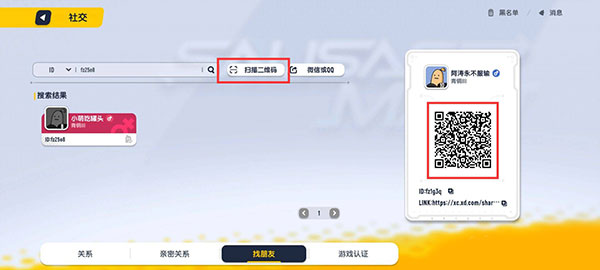 2、进了社交页面后,在底下那一排里找到“找朋友”,然后在搜索框里输入朋友的游戏ID或者昵称,点搜索就能找到了。之后点他名片右下角的小按钮加好友就行。
