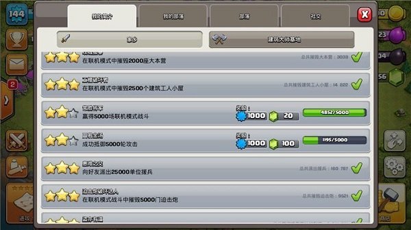 第三、做成就任务。每打到一个新的杯段,就等于完成了一个成就,系统会奖励你一些宝石。特别是打到1250杯的时候,会直接给你450个宝石,这就能直接买第三个工人了。完成其他成就也有不少宝石奖励,所以成就任务一定要记得做。