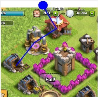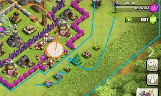 如果敌人在蓝点位置放下弓箭手,那么弓箭手的攻击目标顺序会是训练营,然后是圣水采集器,最后是金矿。需要注意的是,地图的四个边缘是不能当城墙用的,它们挡不住敌人进攻。看下图: