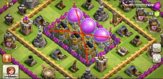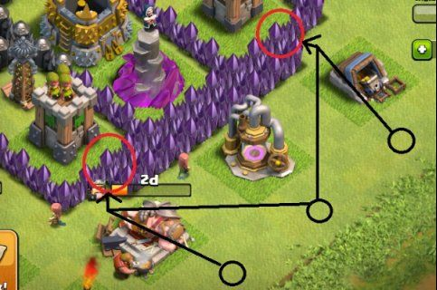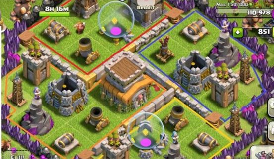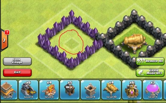 敌人在黑圈处放下的炸弹人,会绕到红圈处去炸墙,中间的法师塔就有机会在它们跑到位置前把它们秒掉。部落城堡是新手最强的防御建筑。当你的城堡里冲出一堆弓箭手、法师、气球兵或者飞龙时,对很多进攻者来说都是一场噩梦。布阵的时候,一定要尽量把部落城堡放在阵型的中心位置,别让敌人能轻易地把你的援兵引出来。对新手来说,从零开始设计一个阵型肯定很难。你可以先去网上找一个适合你当前大本营等级的阵型框架,然后在实际使用中根据自己的经验去慢慢修改,最终创造出一个属于你自己的独特阵型。