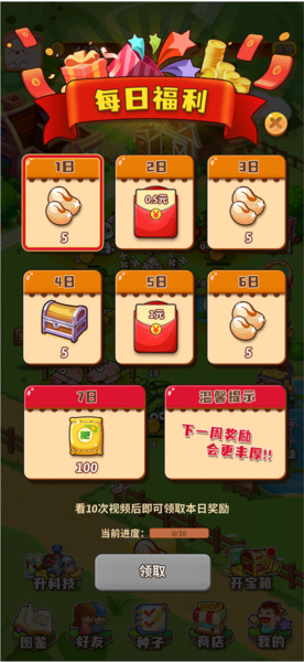 8、开心庄园每天签到能领到现金奖励、种子、宝箱、化肥等东西。