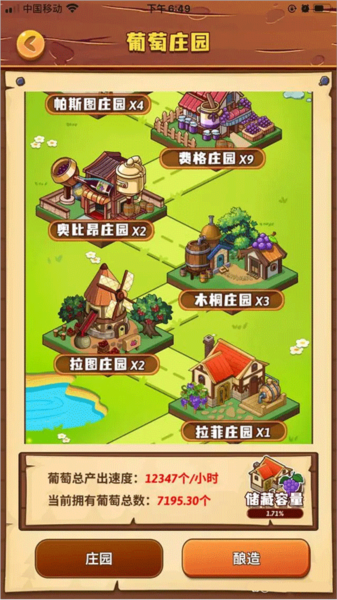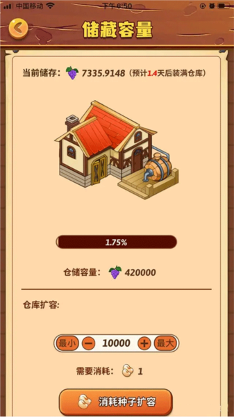 有了地图之后就会根据每个地图的产量开始生产葡萄。初始的存储容量是50000个葡萄,我这里是用豆子把容量扩大到了420000。不然要是忘了时间没去把葡萄加到酿造里,仓库满了就不会再生产葡萄了,等于白白浪费了。