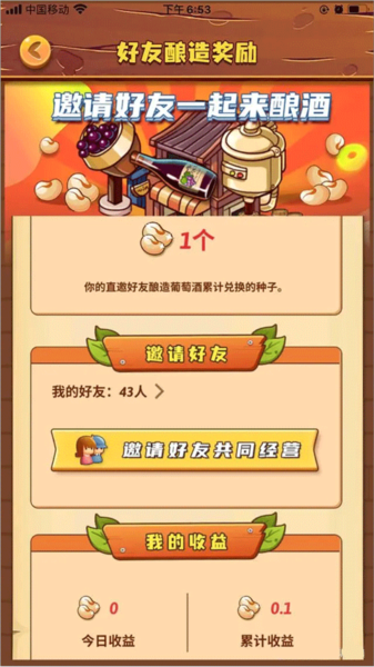 你邀请的好友如果玩葡萄庄园,会按10%的比例给你返还种子。就像下图这样,好友通过葡萄庄园赚了1个种子,系统就会返给我0.1个种子。不过我邀请的好友大部分都没怎么玩,注册完玩一天就没影了,想找个人一起玩都联系不上。