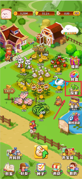 2、开心庄园前期作物升级后,先别急着收割,最好先把金币产量提上去,用来开宝箱和探索(因为每次收割除了土地之外,其他东西都会被清零)。