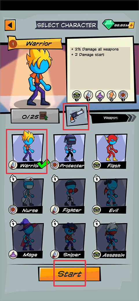 2、接着就到了选人界面。这里能看到一堆英雄,每个英雄用的武器都标出来了,差别挺大的,自己看着顺眼的挑一个。选好了直接点那个大大的“start”按钮开干。