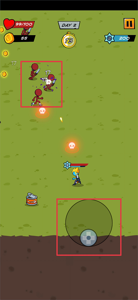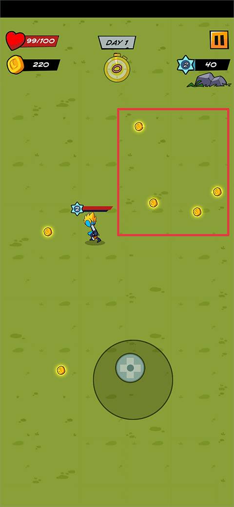 3、进了游戏,左下角那个虚拟摇杆就是控制你移动的,手指搓起来就行。你要做的就是一边风骚走位躲弹幕,一边让你的武器自动攻击,把地图上刷出来的怪全都清掉。