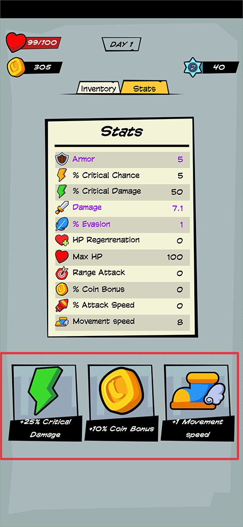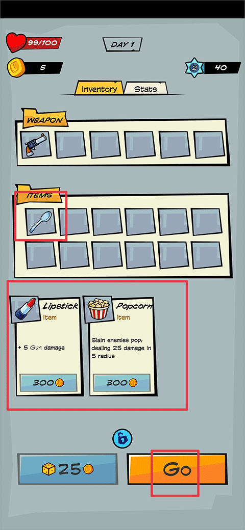 6、你在游戏里辛辛苦苦捡的金币,在这里就能派上用场了。每打完一波,可以用金币在下面三个商店技能里买升级,只要你有钱,全买了都行。